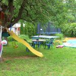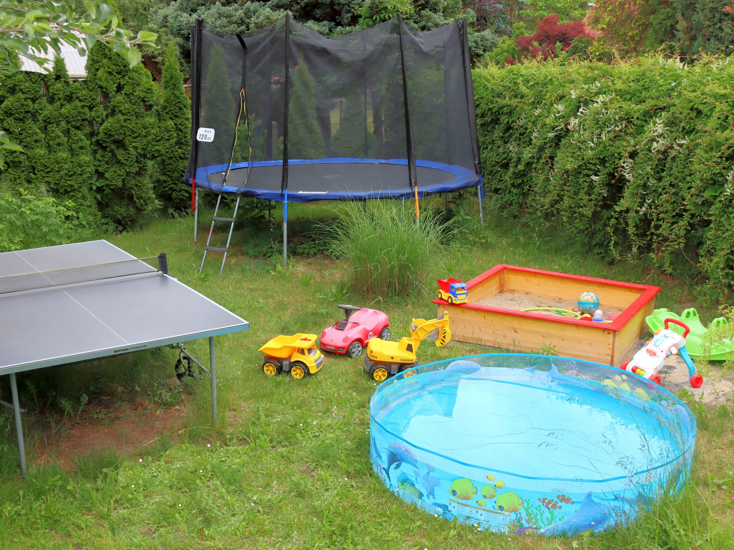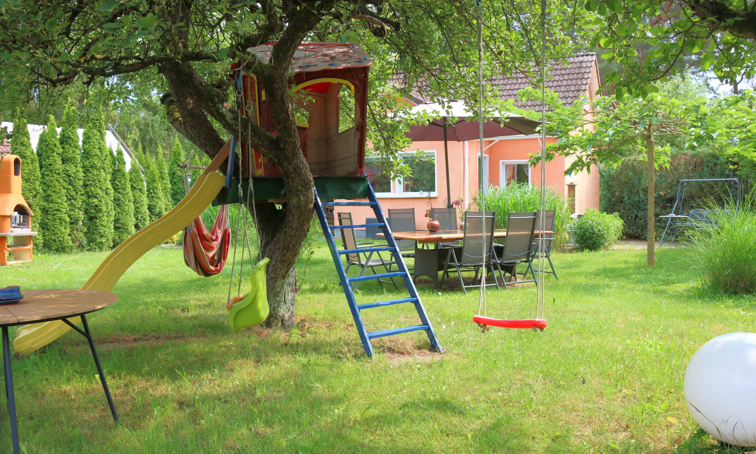 Die kleinen Gäste lädt ein Kinderspielplatz mit Trampolin, Baumhaus, Plantschbecken, Buddelkasten, Rutsche, 2 Schaukeln und eine Tischtennisplatte ein.