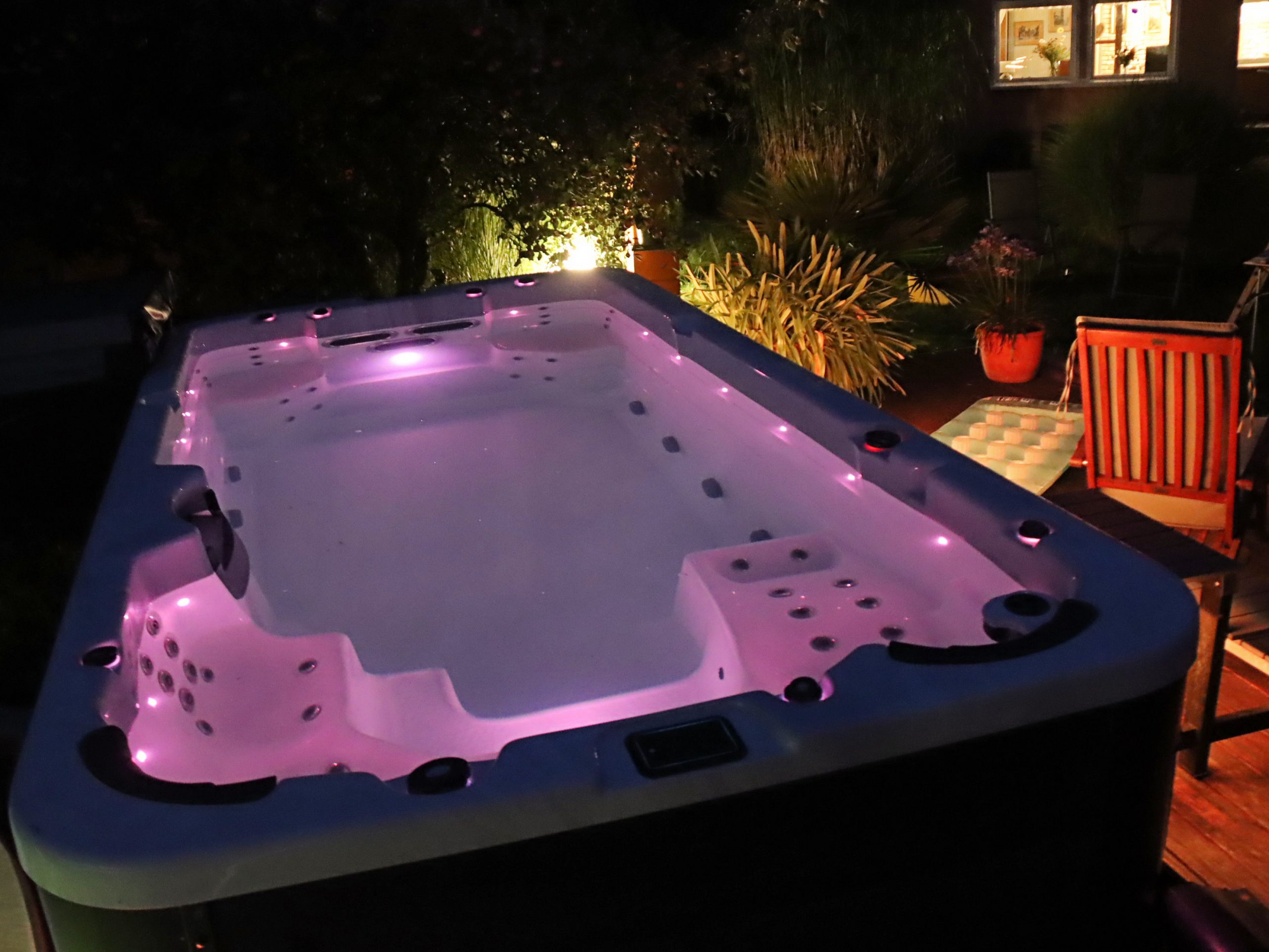 Alle Pollfunktionen mit Heizung ( bis 34 Grad ), 6 Whirlpoolplätze, Gegenstromanlge und das stimmungsvolle bunte LED- Unterwassernachtlicht können für 90 Euro pro Übernachtung gebucht werden.